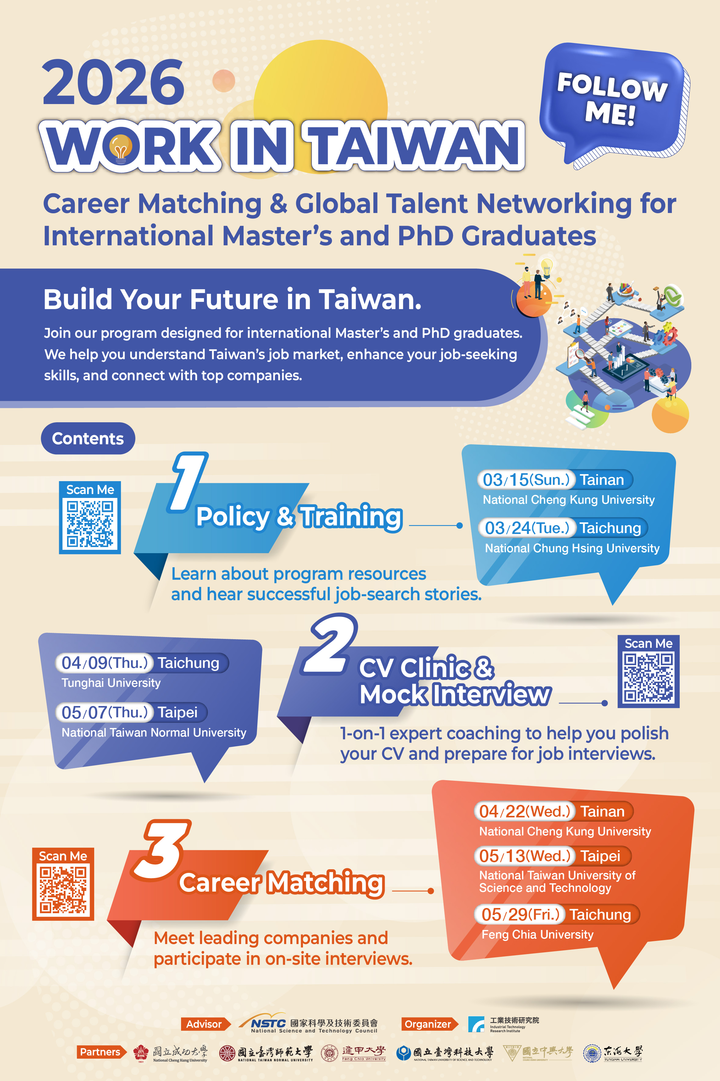 一、為協助境外碩博生畢業後順利留臺工作,特別舉辦國際碩博生就業媒合暨交流活動。本次活動與工研院合辦,希望透過履歷健檢、模擬面試及講座等活動,增加國際碩博生履歷能見度,發掘更多具備跨文化背景及語言優勢的人才。